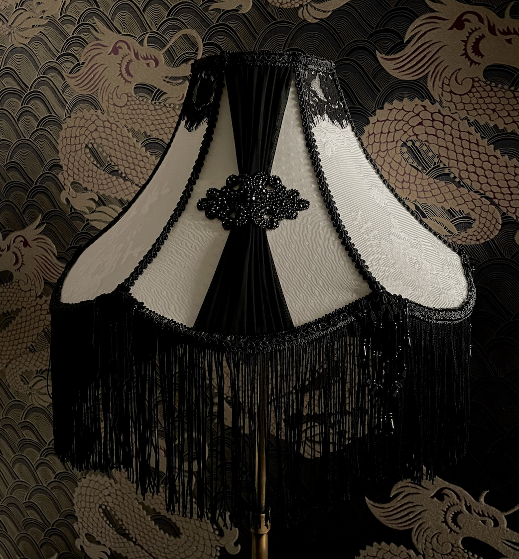 Each lampshade is meticulously crafted to enhance your space and imbue it with a unique personal touch. Handmade using vintage and second-hand materials, our shades are one-of-a-kind creations. Custom orders are welcomed through commission, allowing you to truly personalize your shade to your preferences. Available shades will be listed on the site for purchase once finished, and can be used as references for made-to-order items if they are no longer available. For further details or inquiries, please don't hesitate to reach out to us!